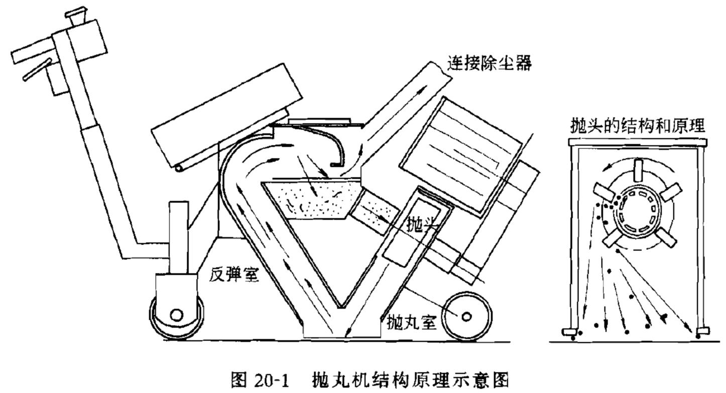 拋丸機是利用電機驅(qū)動的拋丸輪產(chǎn)生的離心力將大量的鋼丸以一定的方向“甩”出,這些鋼丸以巨大的沖擊能量打擊待處理的表面,然后在大功率除塵器的協(xié)助下返回到儲料斗循環(huán)使用。拋丸機的結構原理見圖20-1。