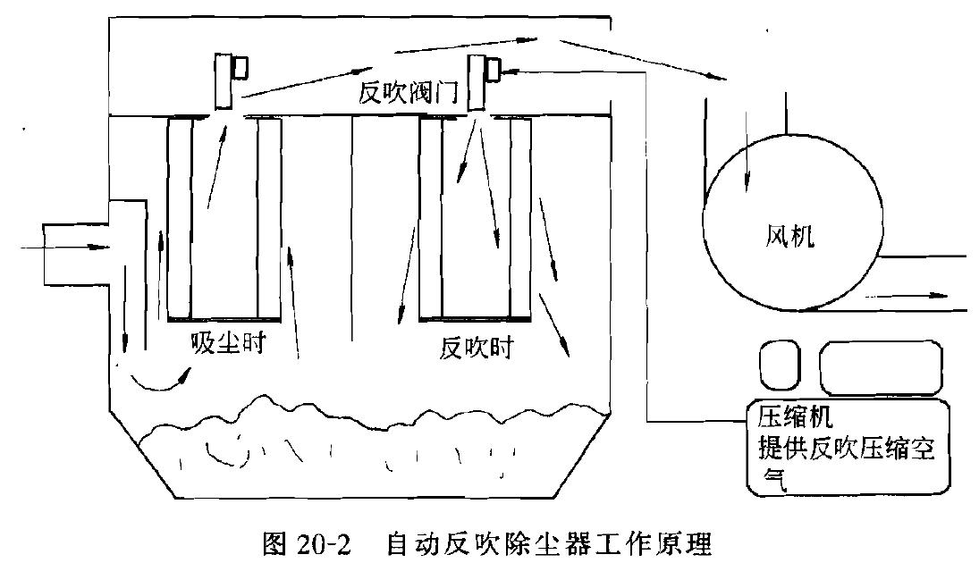 塵分離,丸料進入儲料斗繼續(xù)循環(huán)使用,灰塵則通過連接管進入除塵器。自動反吹除塵器的結構原理見圖20-2。