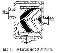 圖3-21表示了塞柱閥調節輸氣量的工作原理。塞柱閥的啟閉是通過電磁閥控制液壓泵中油的進出來實現的。塞柱閥調節輸氣量只能實現有級調節。這種調節方法在小型、緊湊型螺桿壓縮機中常常可以看到。